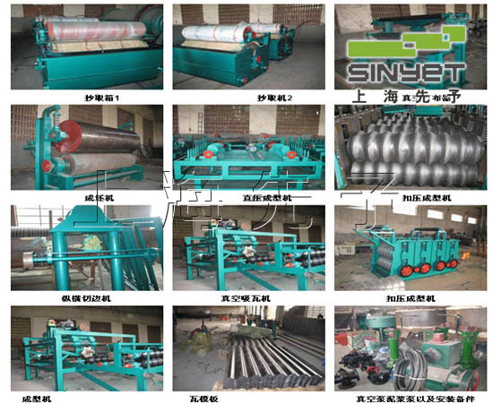 工艺一、抄取机。作用:把原浆中的水份分离并同时把浆料送到打布器脱水,然后成坯; 二、打布器。作用:用于浆料再次脱去多余水份,同时把脱料后毛布表面的杂质清洗掉; 三、成坯机。作用:把从成坯机上脱下来的毛坯瓦送至直压机; 四、接坯机。作用:把从成坯机上脱下来的毛坯瓦送至直压机; 五、直压机。作用:把石棉瓦毛坯压制成型; 六、扣压机。作用:把压制成型后的石棉瓦加压成型; 七、切边机。作用:要据客户需求把成型后的瓦毛边切去; 八、吸瓦机。作用:把制作后的瓦堆起来; 九、搅拌机。作用:把按比例配好的原料加水后充分搅拌; 十、风机。作用:和吸瓦机配合,给吸瓦机提供气流; 十一、真空机。作用:和打布 器配合吸干毛布中的水份; 十二、气水分离。作用:分离水的容器; 十三、输送机。作用:运输石棉瓦用长度可制定。
